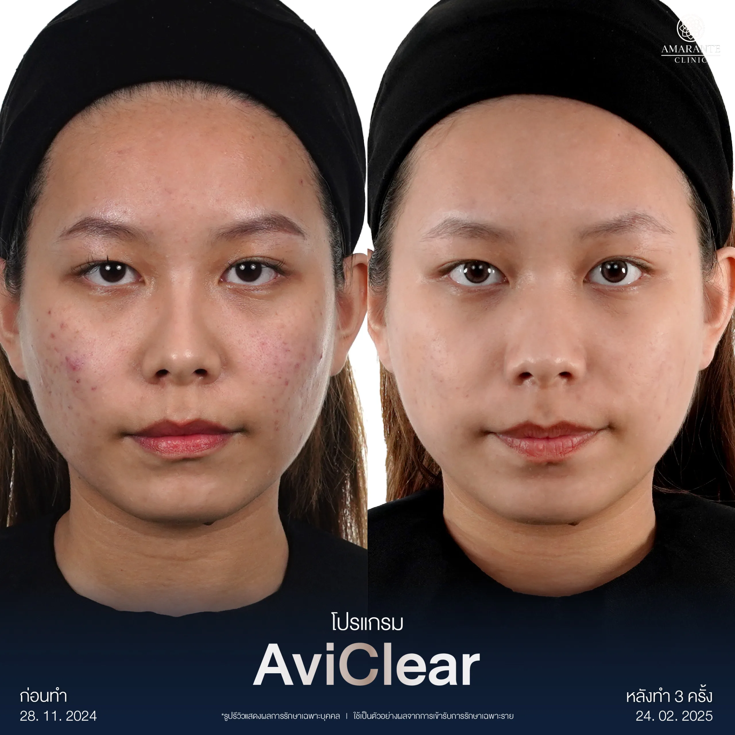 ซึ่งโปรแกรม Aviclear Laser เป็นเลเซอร์ที่ออกแบบมาเพื่อจัดการปัญหาสิวโดยเฉพาะ ด้วยการเข้าไปลดการทำงานของต่อมไขมัน ช่วยควบคุมความมัน ลดการอุดตัน และลดการอักเสบของผิว จึงเหมาะสำหรับผู้ที่มีสิวอักเสบ สิวเรื้อรัง หรือสิวที่เกิดซ้ำง่าย พร้อมช่วยฟื้นฟูผิวให้กลับมาเรียบเนียนโดยไม่ทำลายผิวชั้นบน