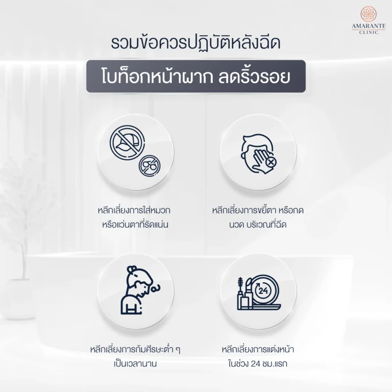 - หลีกเลี่ยงการสัมผัส นวด หรือกดบริเวณใบหน้า โดยเฉพาะในช่วง 24 ชั่วโมงแรก