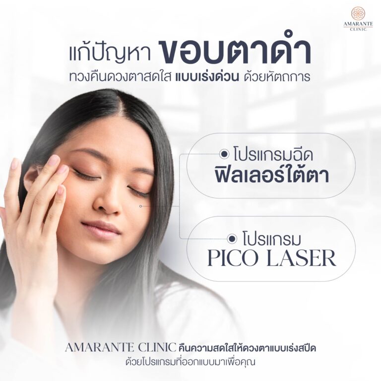 - Amarante Clinic แก้ไขปัญหาขอบตาดำ ใต้ตาคล้ำ ด้วยโปรแกรมฟิลเลอร์ใต้ตา และโปรแกรม Picosure Laser เทคโนโลยีที่มีประสิทธิภาพสูง จบทุกปัญหารอบดวงตา