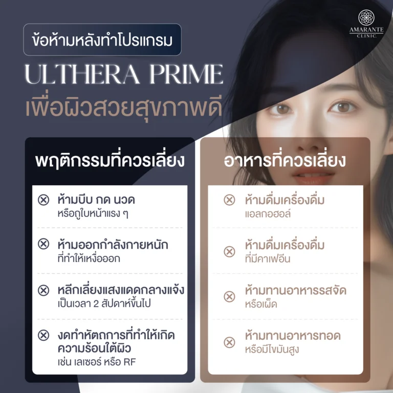 Ulthera Prime เป็นเทคโนโลยียกกระชับผิวด้วย Ultrasound Therapy ในการส่งพลังงานลงไปกระตุ้นการสร้างคอลลาเจน และอีลาสตินในชั้นผิวลึก เพื่อช่วยให้ผิวกระชับขึ้นเป็นธรรมชาติ ลดเลือนริ้วรอย และช่วยให้ใบหน้าดูอ่อนเยาว์ขึ้น ซึ่งเทคโนโลยีนี้ ได้รับการรับรองจากองค์การอาหาร และยาแห่งสหรัฐอเมริกา (FDA) ว่ามีความน่าเชื่อถือ และให้ผลลัพธ์ที่มีประสิทธิภาพ แต่อย่างไรก็ตาม หลังจากทำแล้ว ก็ควรปฏิบัติตามข้อห้ามหลังทำ Ulthera Prime อย่างเคร่งครัด เพื่อให้ได้ผลลัพธ์ที่ตรงใจ และลดผลข้างเคียงที่อาจส่งผลกระทบต่อผิวให้น้อยลงอย่างมีประสิทธิภาพ