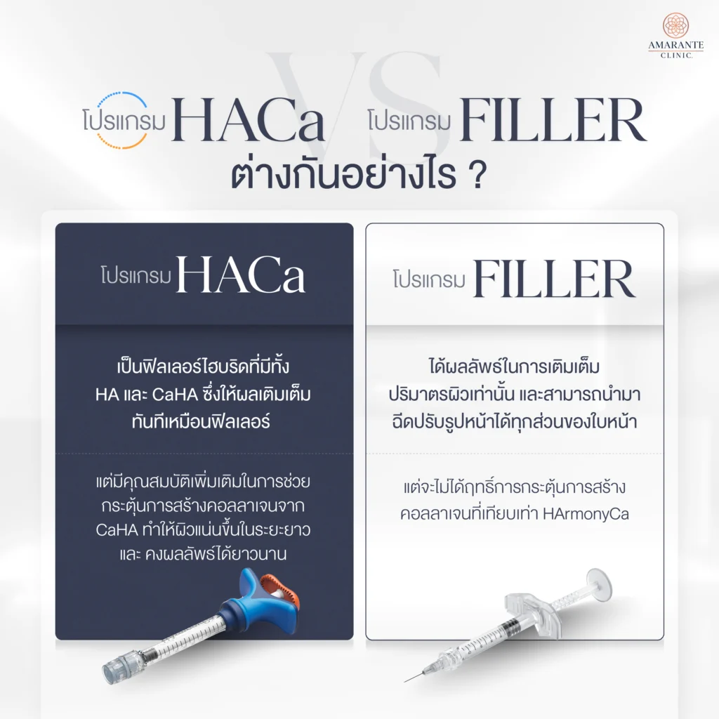 โปรแกรม HArmonyCa เป็นฟิลเลอร์ไฮบริดที่มีทั้ง Hyaluronic Acid และ Calcium Hydroxylapatite ซึ่งให้ผลเติมเต็มทันทีเหมือนฟิลเลอร์ แต่จะมีความแตกต่างตรงที่มีคุณสมบัติเพิ่มเติมในการช่วยกระตุ้นการสร้างคอลลาเจนจาก CaHA ทำให้ผิวแน่นขึ้นในระยะยาว และคงผลลัพธ์ได้ยาวนานกว่า แต่ถ้าหากเกิดผลข้างเคียงหรืออันตราย ก็จะไม่สามารถสลายออกได้หมด เนื่องจากในปัจจุบันมีเพียงตัวยาสลาย HA filler เท่านั้น ต้องรอให้ร่างกายสลายเอง
