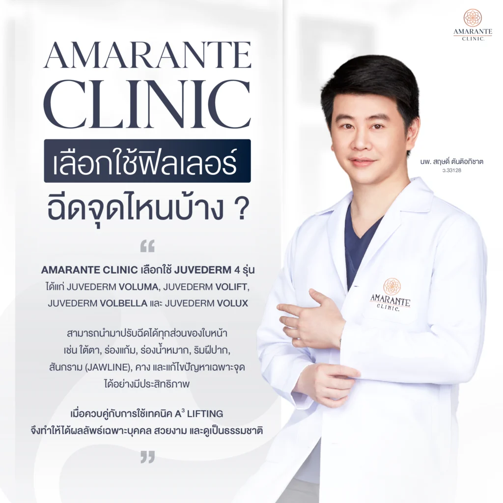 Amarante Clinic เลือกใช้ Juvederm 4 รุ่น ได้แก่ Juvederm Voluma, Juvederm Volift, Juvederm Volbella และ Juvederm Volux สามารถนำมาปรับฉีดได้ทุกส่วนของใบหน้า เช่น ใต้ตา, ร่องแก้ม, ร่องน้ำหมาก, ริมฝีปาก, สันกราม(Jawline),คาง และแก้ไขปัญหาเฉพาะจุดได้อย่างมีประสิทธิภาพ ในแต่ละรุ่นก็จะเหมาะสมสำหรับการนำมาฉีดในแต่ละบริเวณ ขึ้นอยู่กับทีมแพทย์เป็นผู้ประเมินให้ เนื้อเจลมีความยืดหยุ่น ขึ้นรูปได้ง่าย และทำให้ Lifting ผิวได้ดี เมื่อควบคู่กับการใช้เทคนิค A³ Lifting จึงทำให้ได้ผลลัพธ์เฉพาะบุคคล สวยงามและดูเป็นธรรมชาติ