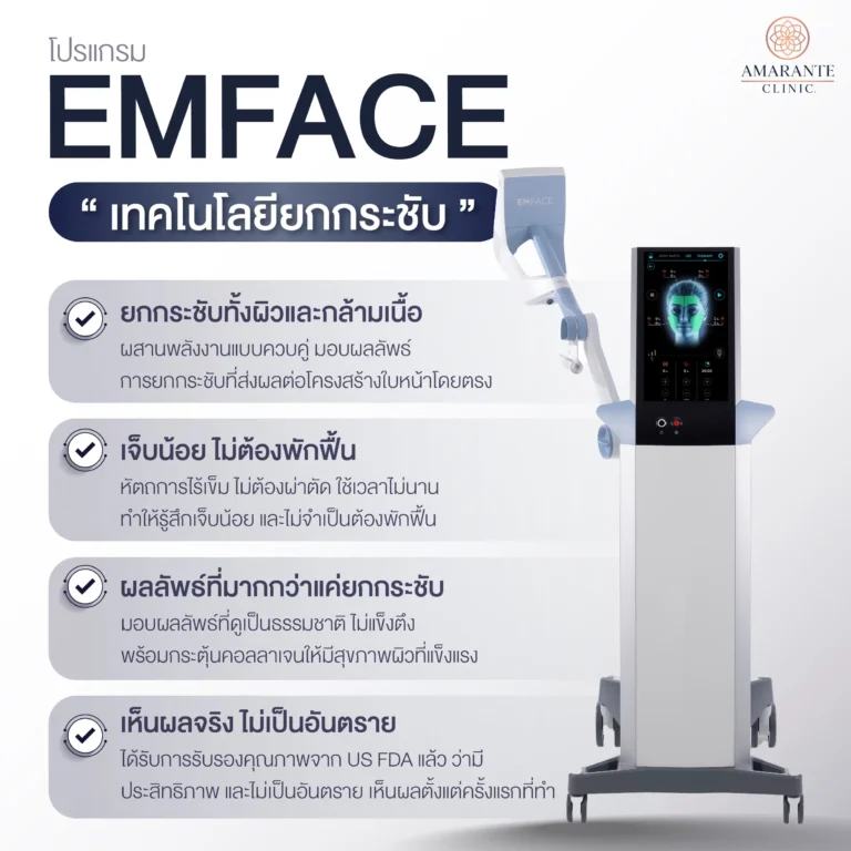 ก่อนที่จะตัดสินใจเข้ารับบริการความงาม อย่าลืมว่าการทำความเข้าใจเกี่ยวกับเทคโนโลยีที่ใช้เป็นเรื่องที่สำคัญมาก ๆ โดยเฉพาะกับโปรแกรม Emface เทคโนโลยียกกระชับใบหน้ารุ่นใหม่ที่ได้รับการรับรองจากองค์การอาหารและยา (FDA) ของสหรัฐอเมริกา ว่าเป็นหัตถการที่มีประสิทธิภาพ และไม่เป็นอันตราย รวมทั้งยังได้รับความนิยมเป็นอย่างมาก เนื่องจากสามารถยกกระชับได้ทั้งผิวหนัง และกล้ามเนื้อไปพร้อม ๆ กันโดยไม่ต้องใช้เข็ม ไม่จำเป็นต้องผ่าตัด และไม่ต้องใช้เวลาพักฟื้น ในบทความนี้ เราจะมาเจาะลึกเกี่ยวกับโปรแกรม Emface กันว่าคืออะไร มีจุดเด่นอย่างไร เหมาะกับใคร และมีความแตกต่างจากเทคโนโลยีอื่น ๆ อย่างไรบ้าง ไปดูกันเลย
